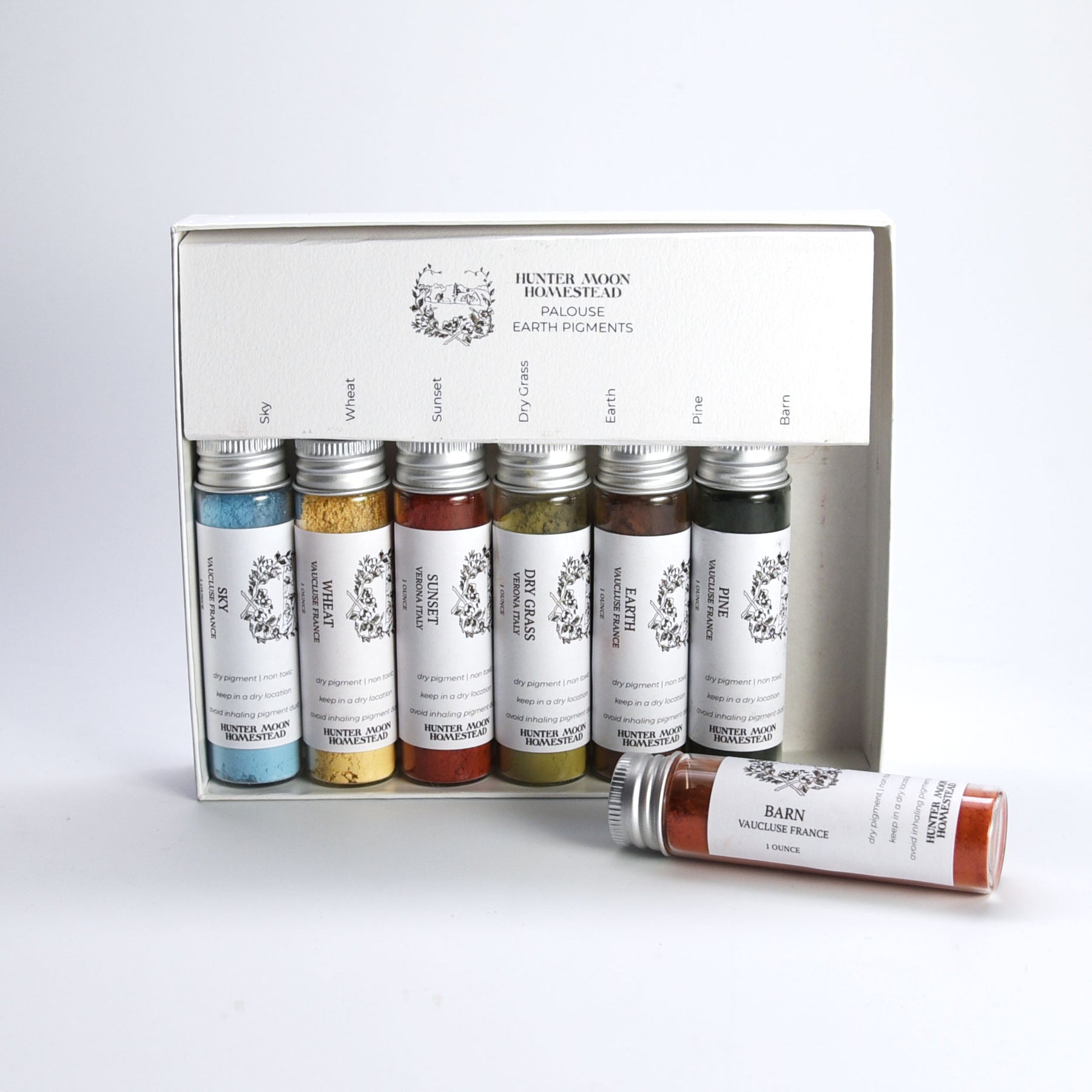 We've searched the world over for the finest quality artist pigments! Make your own watercolor, oil, gauche paint or pastels. This stunning palette was curated from the natural landscape at Hunter Moon Homestead in the Palouse prairie.